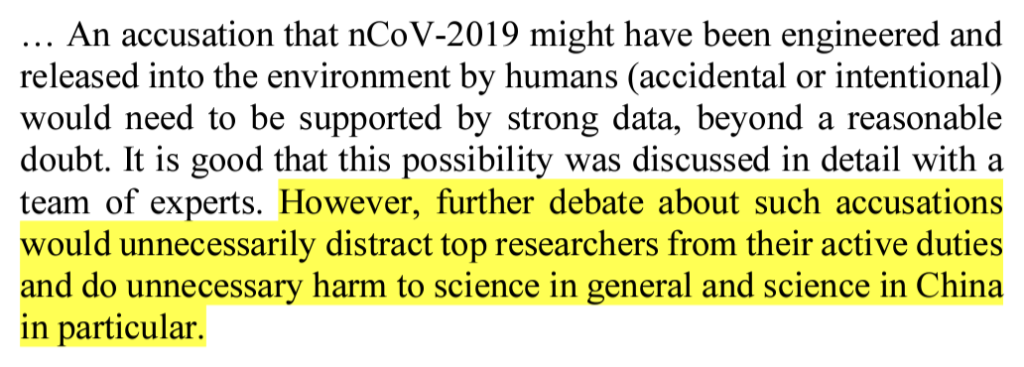 Yet it’s clear from the preceding sentences that he regards the lab leak as a possibility, noting that it would “need to be supported by strong data”.