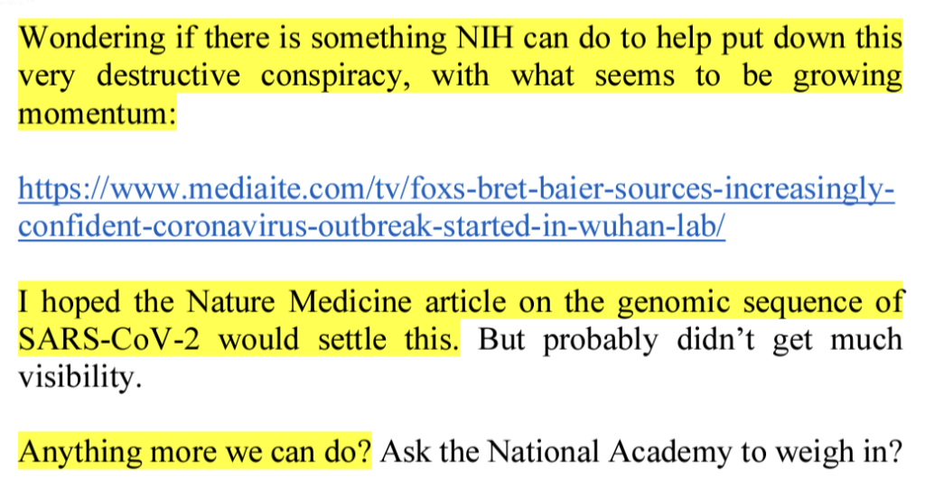 In a later email (shown below), Collins explicitly referred to the lab leak as a “very destructive conspiracy”, asking his colleagues whether there was something the NIH could do to “help put [it] down”.