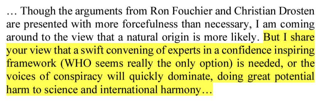 In one email (shown below), Francis Collins – former director of the National Institutes of Health – expressed the need for a “swift convening of experts”, or else the “voices of conspiracy will quickly dominate”. This, he feared, could do harm “to science and international harmony”.