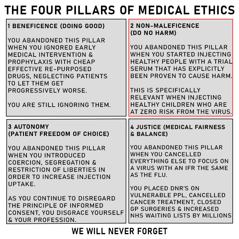 I’ll let you consider whether those ethical pillars have been adhered to in the context of the backlog of non-Covid care (including cancer diagnosis, mental health, impact on education); the blanket medical treatment of low or near zero risk patients; the economic consequences that are eventually bound to impact mostly on the poorer in society; the blatant coercion and stigmatising of non-conforming or sceptical individuals; and the gross lack of a determination to record medically or publicise in the media adverse consequences of an experimental lockdown-and-vaccination strategy. It seems that all the above rules have been tramped on by a hypocritical political elite that parties-on whilst tired-out healthcare professionals wearily acquiesce.