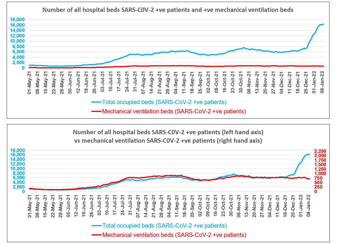 And here is a chart this time of numbers of English +ve test patients in hospital beds and +ve test patients in mechanical ventilation beds, not split by vaccination status from the NHS data this time.