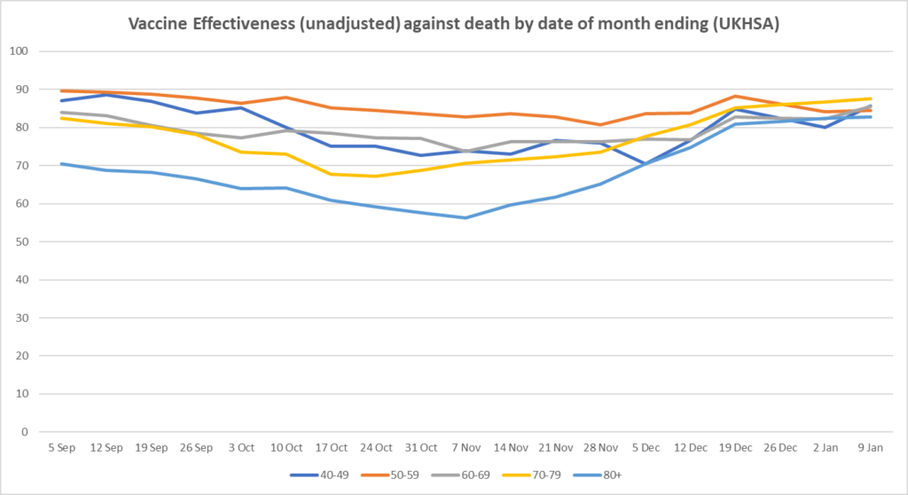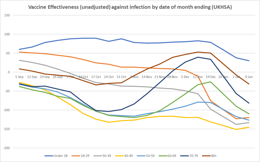 Another possible explanation is that it is an artefact of the high number of incidental hospital admissions in recent weeks, with more than half of Covid hospital admissions being treated primarily for something else. Given vaccines offer little to no protection (or worse) against infection, they will offer the same lack of protection against incidental hospital admission as Omicron spreads in hospitals or is found in those admitted for other reasons. The difference by age may arise because infection rates in those under 50 are currently much higher than in those over 50. In truth, it is likely to be a bit of both, but without data specifically on those being treated primarily for Covid it’s difficult to get to the bottom of which is making the biggest difference.