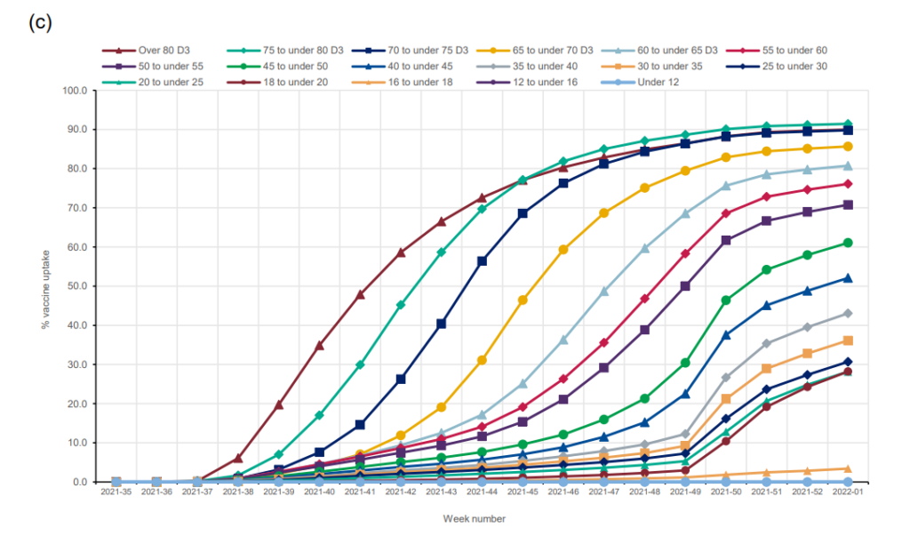The most striking point from this week’s UKHSA Vaccine Surveillance report – with data for the four weeks ending January 9th – is the sharp decline in unadjusted vaccine effectiveness (calculated from raw data, so not adjusted for potential confounders such as risk factors and testing behaviour) against hospitalisation (see above). The decline is particularly sharp for under-50s, with 18-29 year-olds dropping to 38% (meaning the hospitalisation rate was 38% lower among the vaccinated (two or three doses) than the unvaccinated). The sharpness of the drops coincides with the age groups with the lowest third-dose coverage (see below), which suggests it may be a waning effect accelerated by Omicron and offset by boosters.