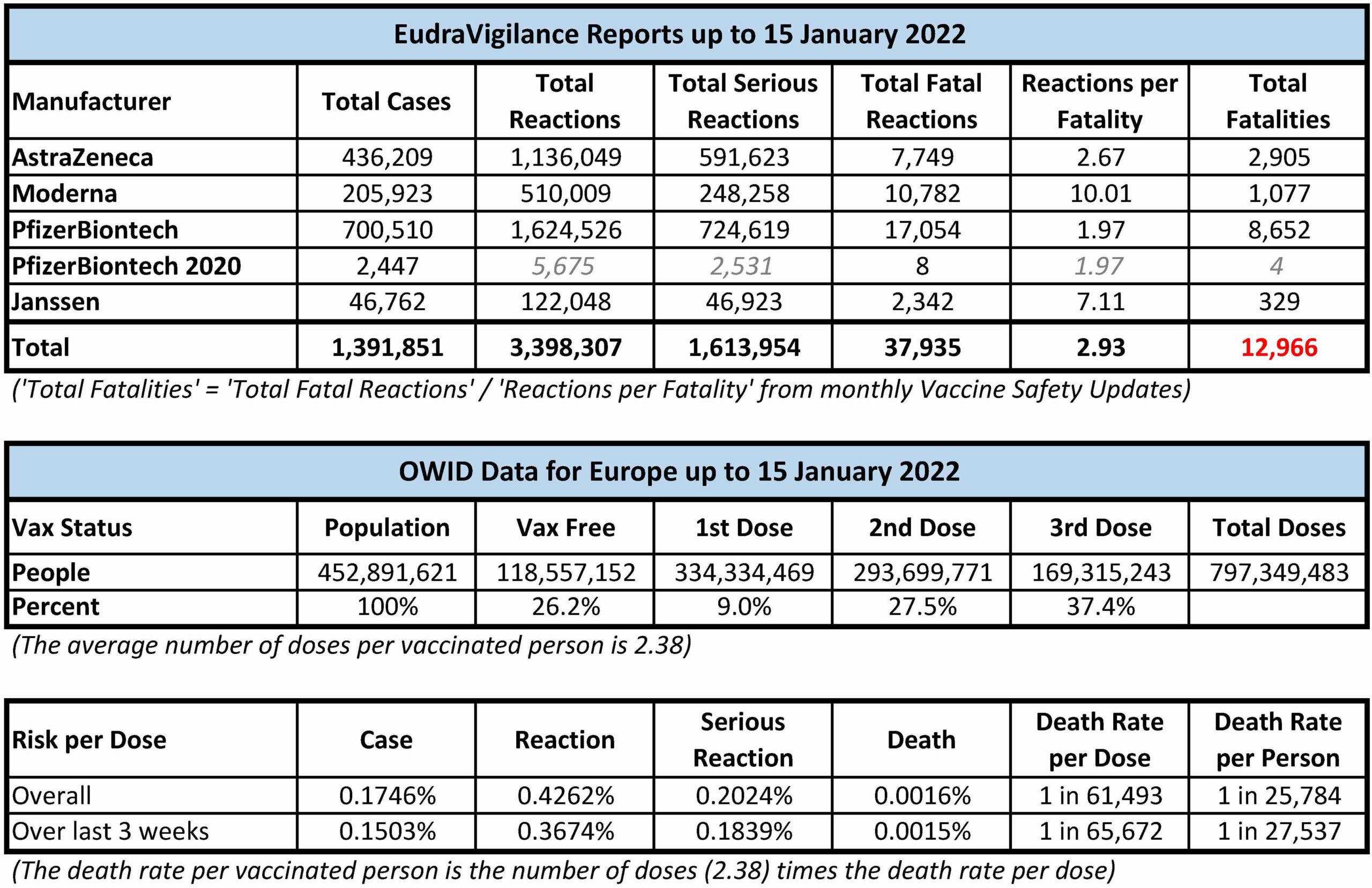 Most people just add up the deaths from the reactions by querying the EudraVigilance database. This provides an incorrect death total as the EMA say here: I initially downloaded the database in Excel format and got a much lower figure. This process became unmanageable, so I resorted to joining in with everyone else. However, I have since found a way to approximate the actual deaths by using their monthly ‘Safety Updates’ which I only found recently here: At the moment there are, on average, nearly 3 reactions per death. Surprisingly, this varies enormously between vaccines: 2 for Pfizer and 10 for Moderna. Anyway, that aside, I factor down each death tally according to vaccine. The current total deaths counted from the reactions is 37,935, but this factors down to 12,966. I go a bit further and add in the vaccination figures from OWID, then determine some sort of risk percentage. I find an average risk per dose, then multiply this by the average number of doses per person to get a net death risk per person that is currently 1 in 27,537. This compares well with the Yellow Card reports for which I currently have 1 in 26,864. (I note… Read more »