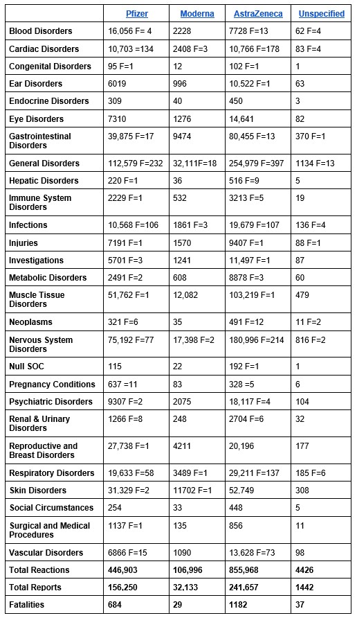 I posted this on Faceberk, providing the link to the above Daily Sceptic article: ****Summary of Adverse Events in the U.K. According to an updated report, the MHRA Yellow Card reporting system has recorded a total of 1,414,293 events based on 431,482 reports. The total number of fatalities reported is 1,932. •Pfizer (25.3 million first doses, 21.9 million second doses) now has one Yellow Card in 162 people vaccinated. Deaths: 1 in 36,988 people vaccinated (684). •AstraZeneca (24.9 million first doses, 24.1 million second doses) has one Yellow Card in 103 people vaccinated. Deaths: 1 in 21,066 people vaccinated (1,182). •Moderna (1.6 million first doses, 1.4 million second doses) has one Yellow Card in 50 people vaccinated. Deaths: 1 in 55,172 people vaccinated (29). Overall, one in every 120 people vaccinated (0.83%) have experienced a Yellow Card adverse event. The MHRA has previously estimated that the Yellow Card reporting rate may be approximately 10% of actual figures. Note that sometimes in Yellow Card reporting, the numbers of adverse events (including fatalities) will be lower than the previous week. The Yellow Card system is a passive reporting system, so in theory this should not happen as all reports should be cumulative.… Read more »
