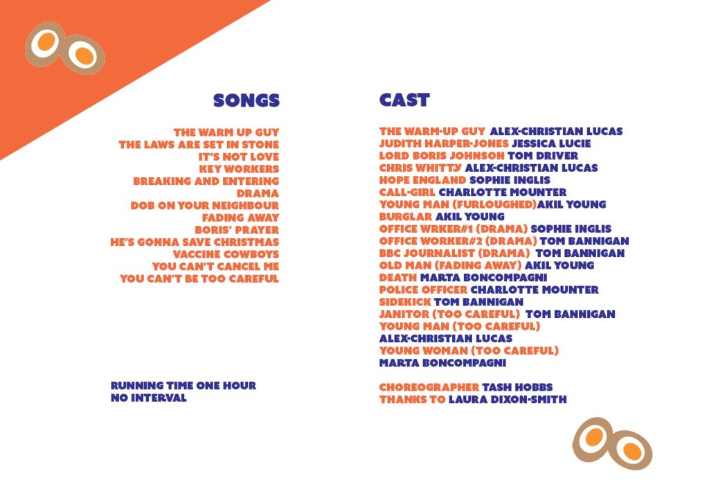 With satirical numbers like, The Laws are Set in Stone and He’s Gonna Save Christmas, combined with the pathos of songs like, Fading Away and We’re All Key Workers After All, this musical romp will provide thought-provoking satire and a much-needed Covid boost – without the need for a fourth jab.