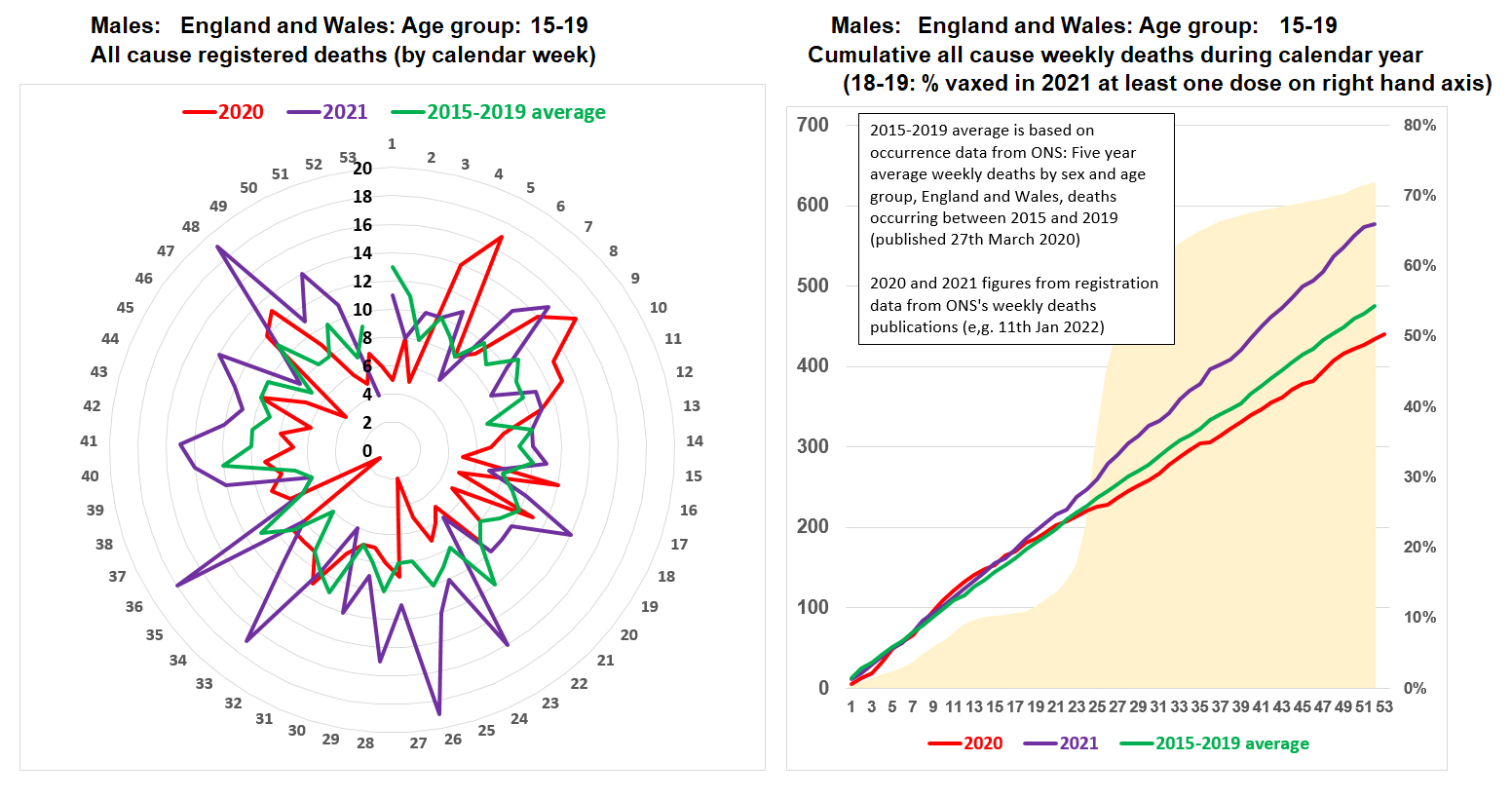 Here is the chart for 15-19 year oild males again based on the ONS data with first dose experimental vaccination in 2021 shown by the shaded region. Correlation isn’t causation, but no open attempt by the authorities has been made to explain this.
