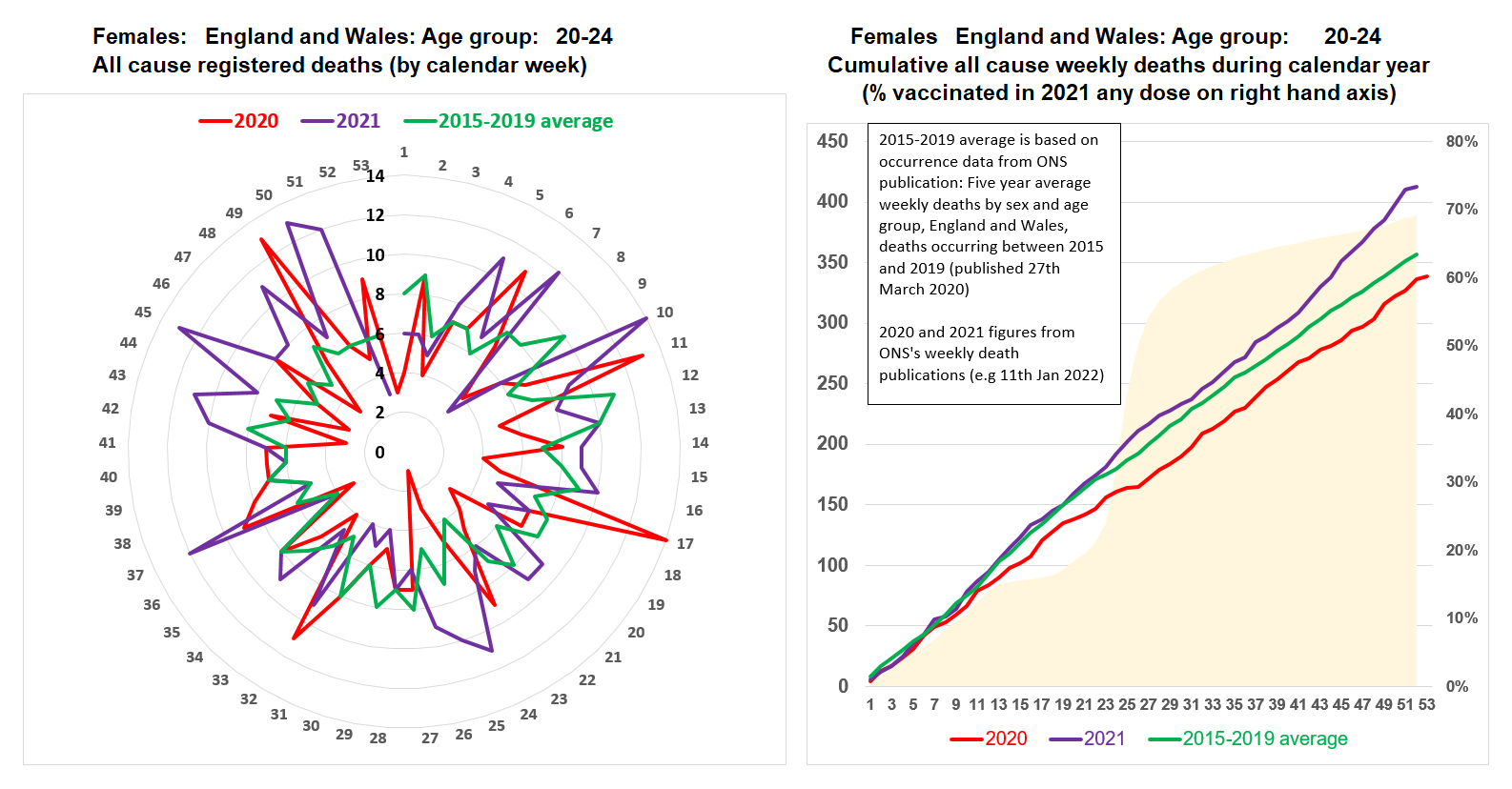 In 2021 all cause mortality was running at around the 2015-2019 average until the time that first doses of the experimental vaccines happened at a pace whereafter all cause mortality rose above the 2015-2019 average until the end of 2021. So the increase happened temporally in relation to the experimental vaccines slightly earlier than for the males.