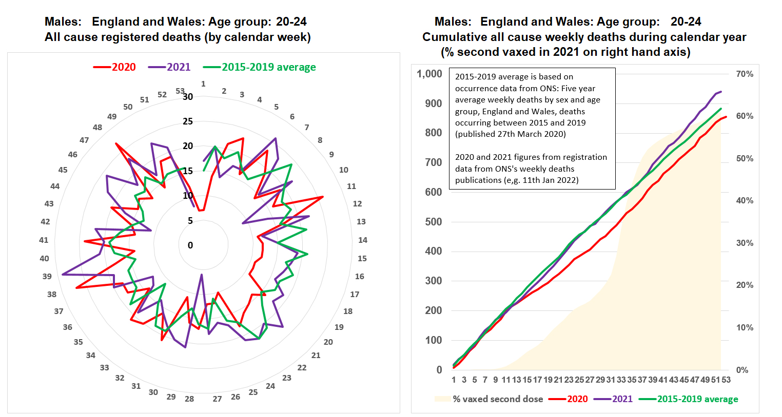 In 2021 all cause mortality was running at around the 2015-2019 average until the time that second doses of the experimental vaccines happened at a pace where all cause mortality eased up above the 2015-2019 average until the end of 2021