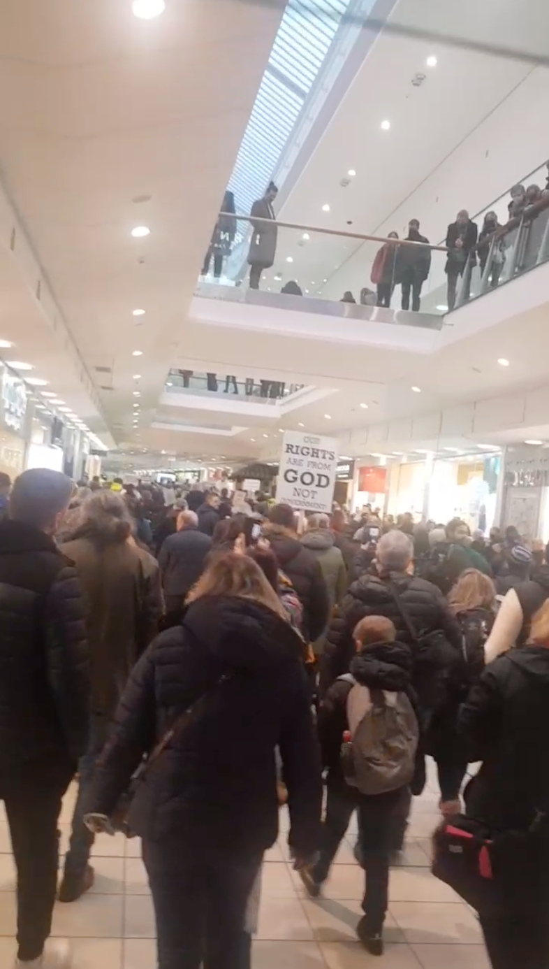 As many as 5000 demonstrating in Glasgow today. Hard to tell exactly but Buchanan St chock-a-block from top to bottom with an unseen tail round the corner into Argyle St. Police took us up Sauchiehall St and corralled us at Rose St. Quick about turn and are corralled again at entrance to Buchanan Galleries Mall. They forgot to guard the doors so the moving mass instinctively flooded into the mall which acted as an acoustic enhancer to our many chants especially, ‘Stick your vaccine passports up your a$%e!’ Strangely uplifting!