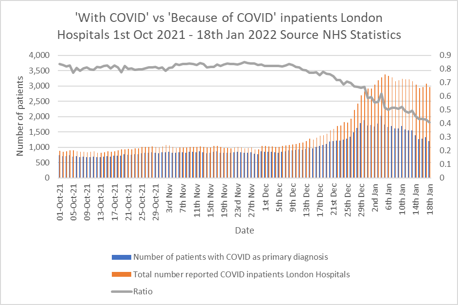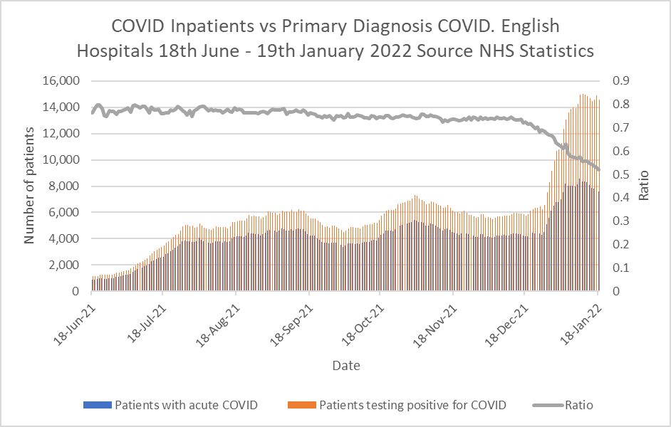 The pattern is repeated in all datasets I have examined. This week the ICNARC report revealed that almost half the 552 patients testing positive for Covid in English ICUs did not have Covid as the primary reason for admission. Before Christmas, when the main variant was Delta, 95% of patients reported as being in ICU with Covid, actually were ill with it. The demand for ICU care for Covid patients has fallen off a cliff since Christmas. In mid-December, 9% of patients admitted to hospital for Covid needed ICU care. Now that percentage is around 2%.