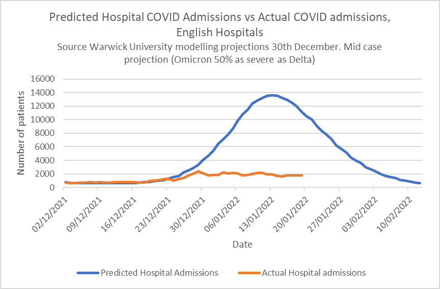 The 103rd meeting of SAGE on January 13th notes that: “The increase in hospitalisations… anticipated following the observed increase in cases in older age groups, has not been seen so far.” Readers may recall a huge increase in admissions of elderly people was confidently predicted after social gatherings around Christmas. Failed to show.