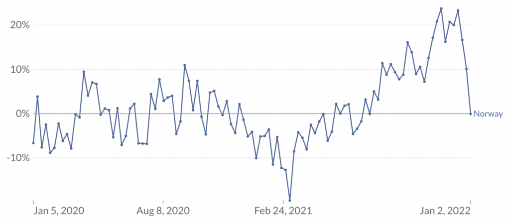 Fourth, Norway saw a moderate uptick in excess mortality in mid October, which was larger than any previous wave. At this time, 68% of the population was double vaccinated, including a much higher percentage of the elderly.