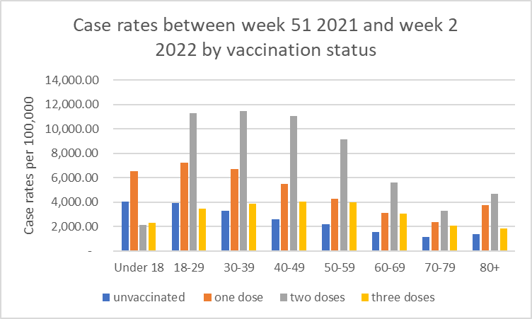 “Latest case rates by vaccination status show that double dosed have rates per 100,000 three times higher than unvaccinated.