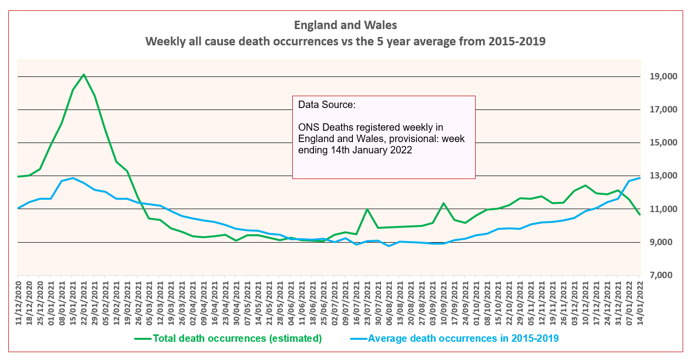 Winter deaths are usually running high at this point in January, but this year is different. According to the latest figures from the ONS, released today, in the week ending January 14th there were 6.1% fewer deaths than the five-year average in England and Wales (872 fewer deaths). Note that the five-year average the ONS uses doesn’t include 2020, but 2016-19 (which has historically low mortality) and 2021.