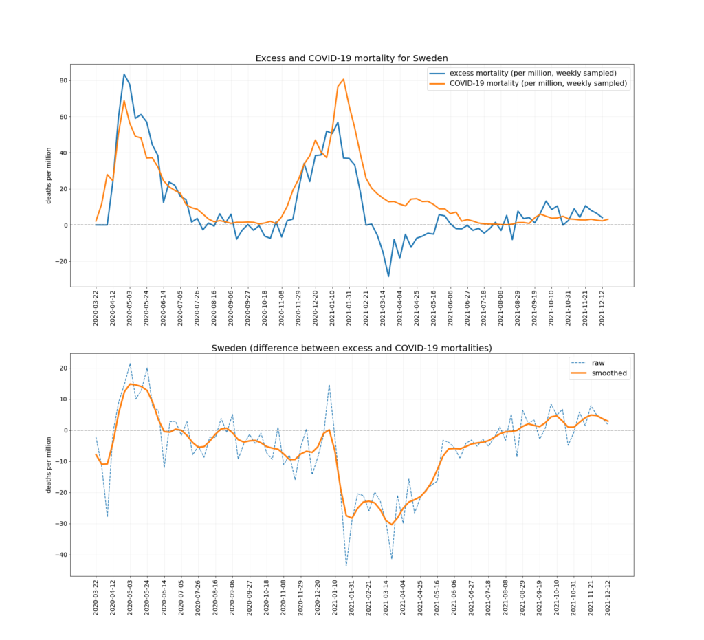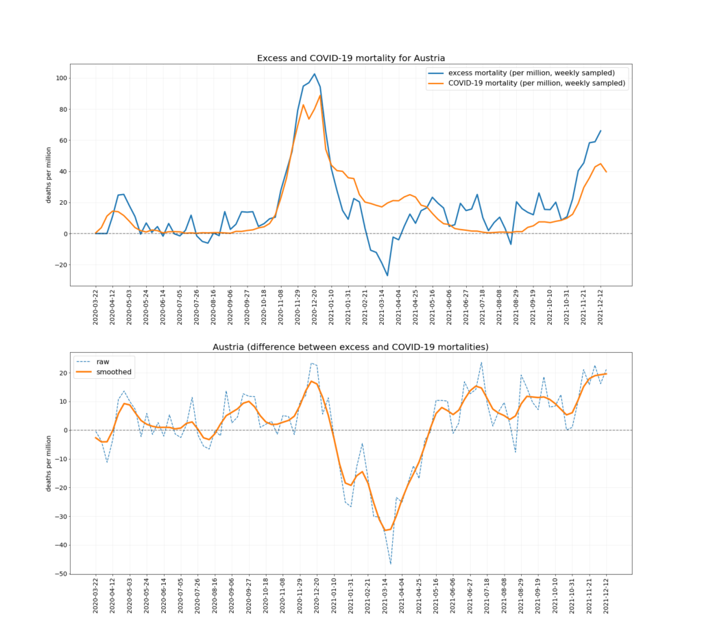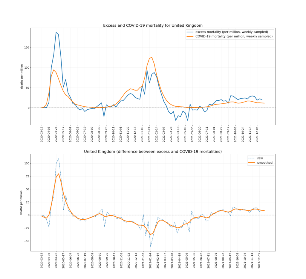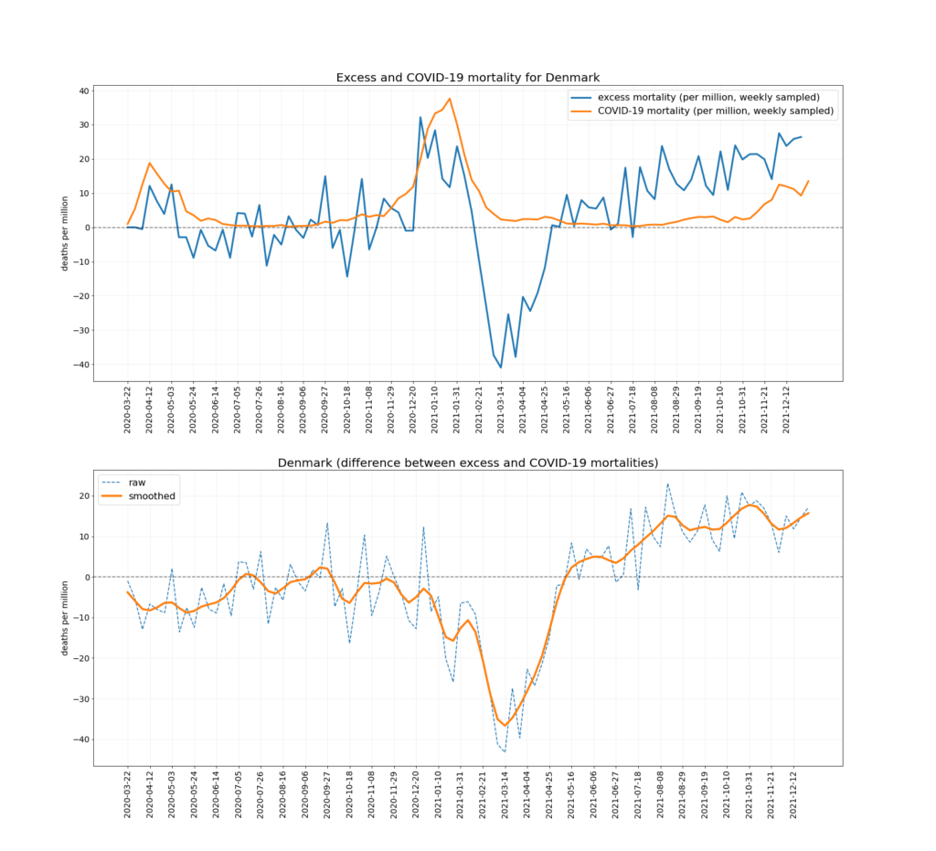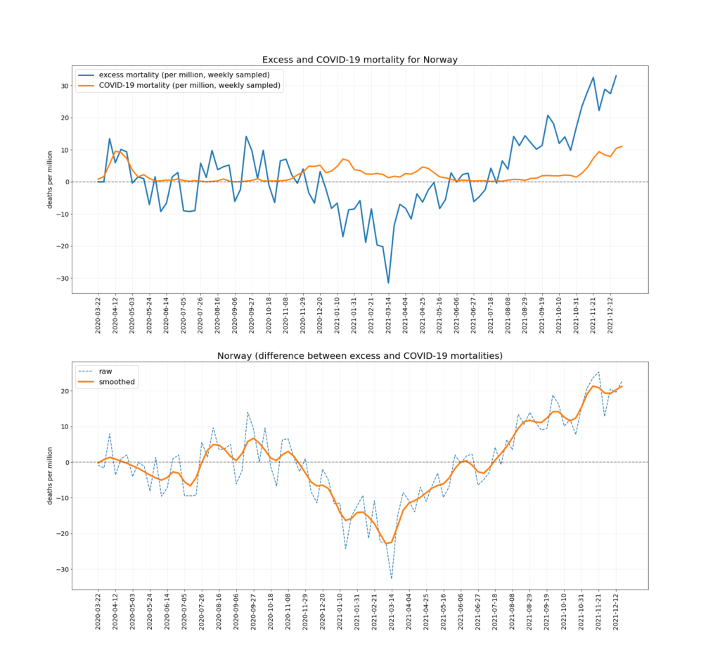The chart below depicts the trends in Covid mortality and excess mortality (top graph) and the difference between them i.e., non-Covid excess mortality (bottom graph) in the nine countries. The data comes from Our World in Data, and the nine countries – Austria, Denmark, Germany, Netherlands, Norway, Portugal, Sweden, Switzerland and U.K. – are the nine Western European countries which report excess deaths data weekly and had data available up to mid-December. Between them they have a population of 218,646,258. To ensure the comparison is as accurate as possible the two curves are aligned using the peak of winter deaths in 2020-21, which allows for additional reporting delays in excess mortality. (This is why the excess mortality line is a week shorter than the Covid mortality line, and also why the figures quoted above are rounded as the estimates are not precise.)