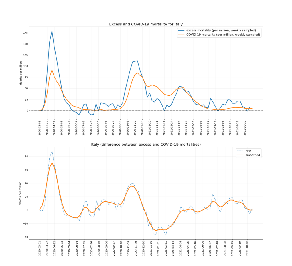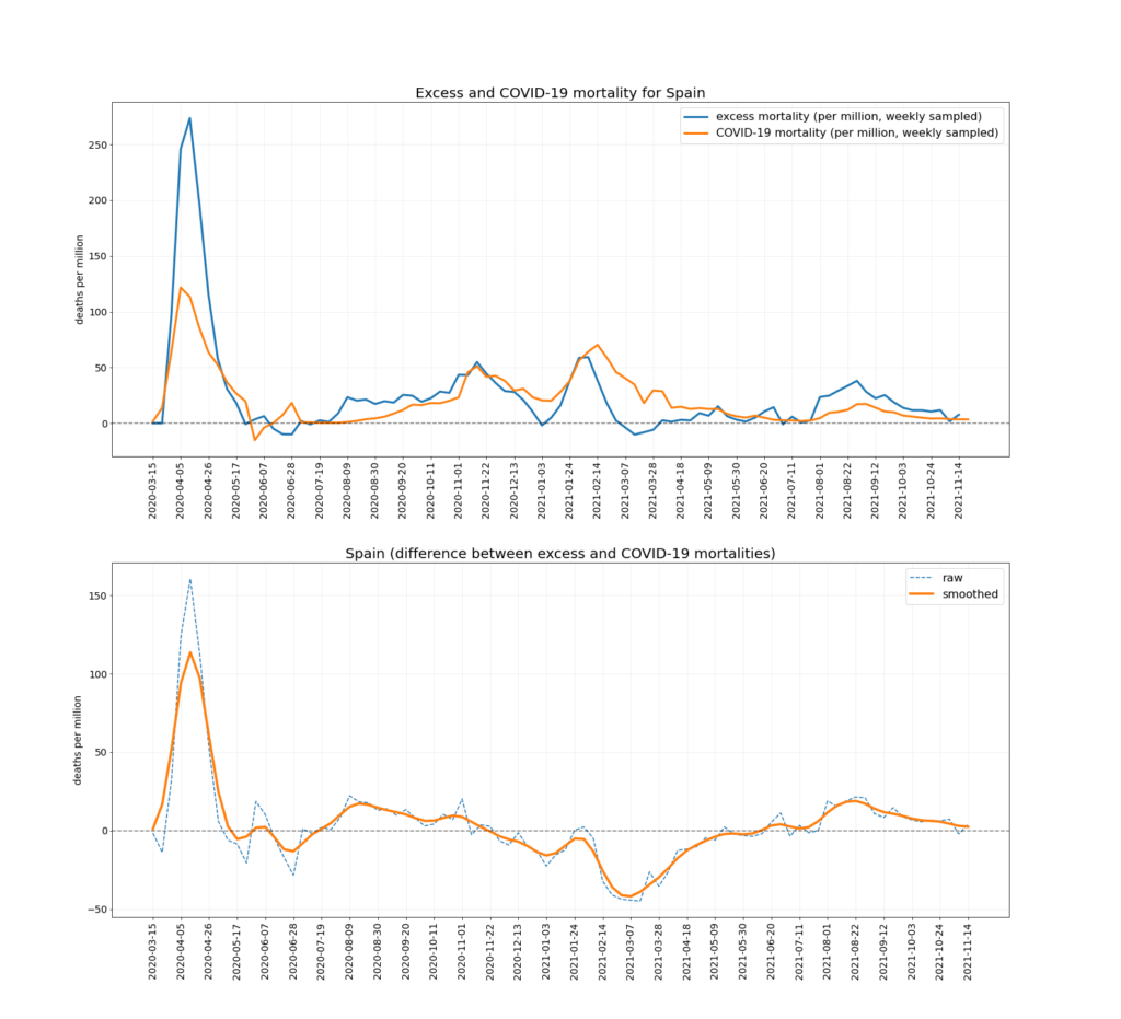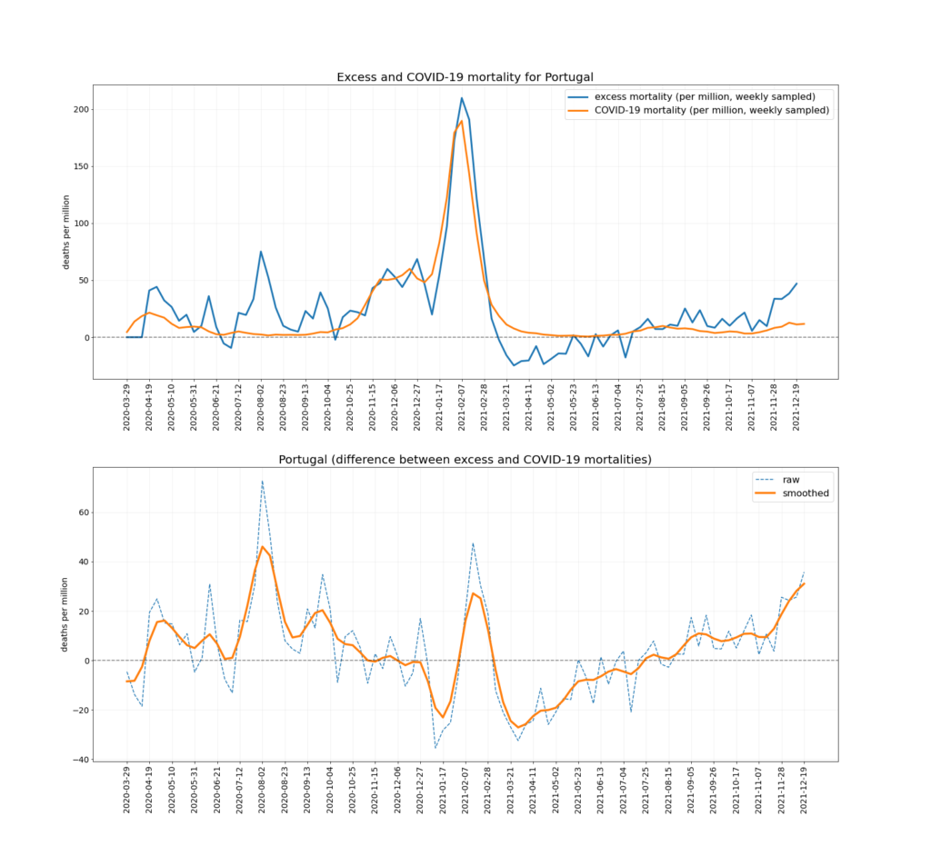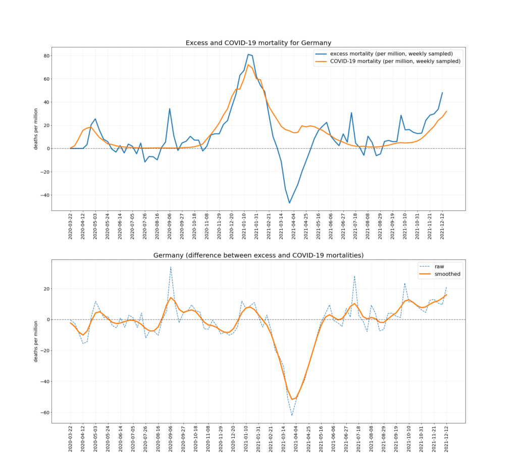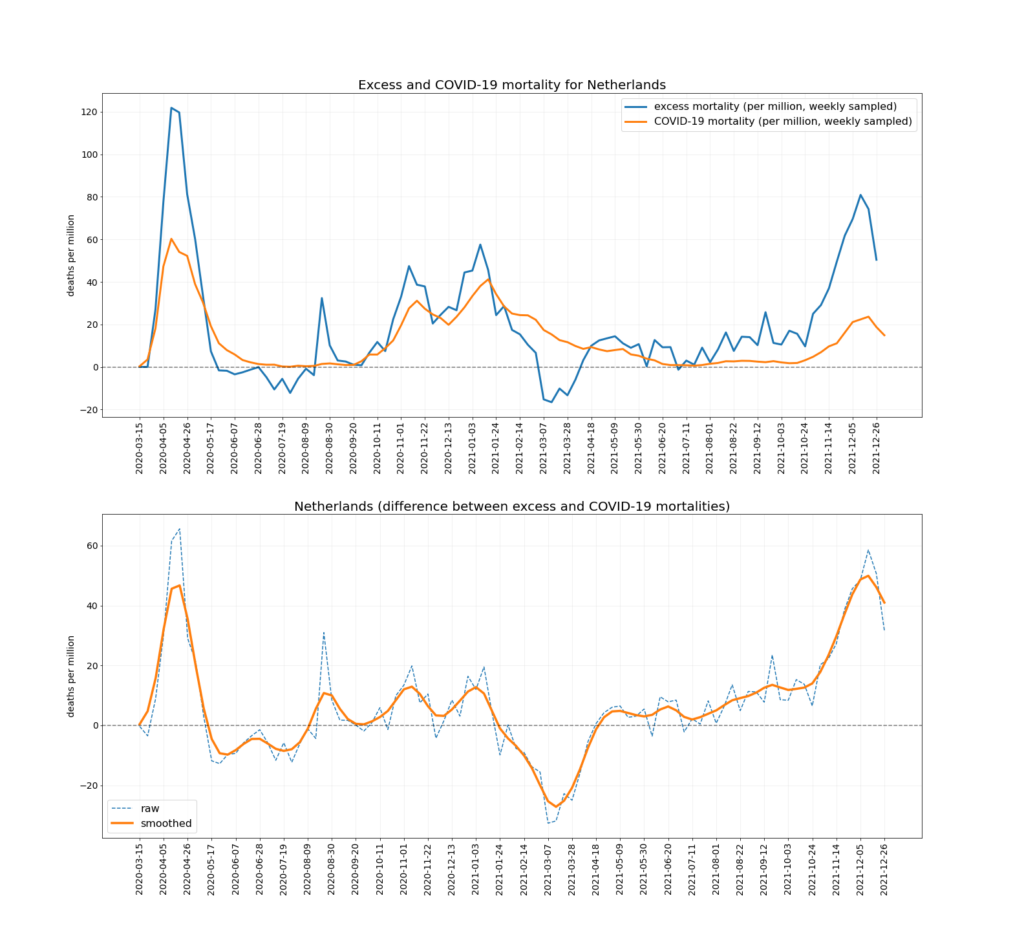 The chart below depicts the trends in Covid mortality and excess mortality (top graph) and the difference between them i.e., non-Covid excess mortality (bottom graph) in the nine countries. The data comes from Our World in Data, and the nine countries – Austria, Denmark, Germany, Netherlands, Norway, Portugal, Sweden, Switzerland and U.K. – are the nine Western European countries which report excess deaths data weekly and had data available up to mid-December. Between them they have a population of 218,646,258. To ensure the comparison is as accurate as possible the two curves are aligned using the peak of winter deaths in 2020-21, which allows for additional reporting delays in excess mortality. (This is why the excess mortality line is a week shorter than the Covid mortality line, and also why the figures quoted above are rounded as the estimates are not precise.)