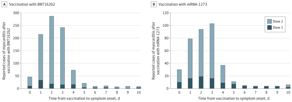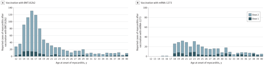 A study published this week in the Journal of the American Medical Association (JAMA) has found that the risk of myocarditis (heart inflammation) after receiving an mRNA Covid vaccine (Pfizer or Moderna) was dramatically increased across many age groups and was highest after the second vaccination dose in young men.