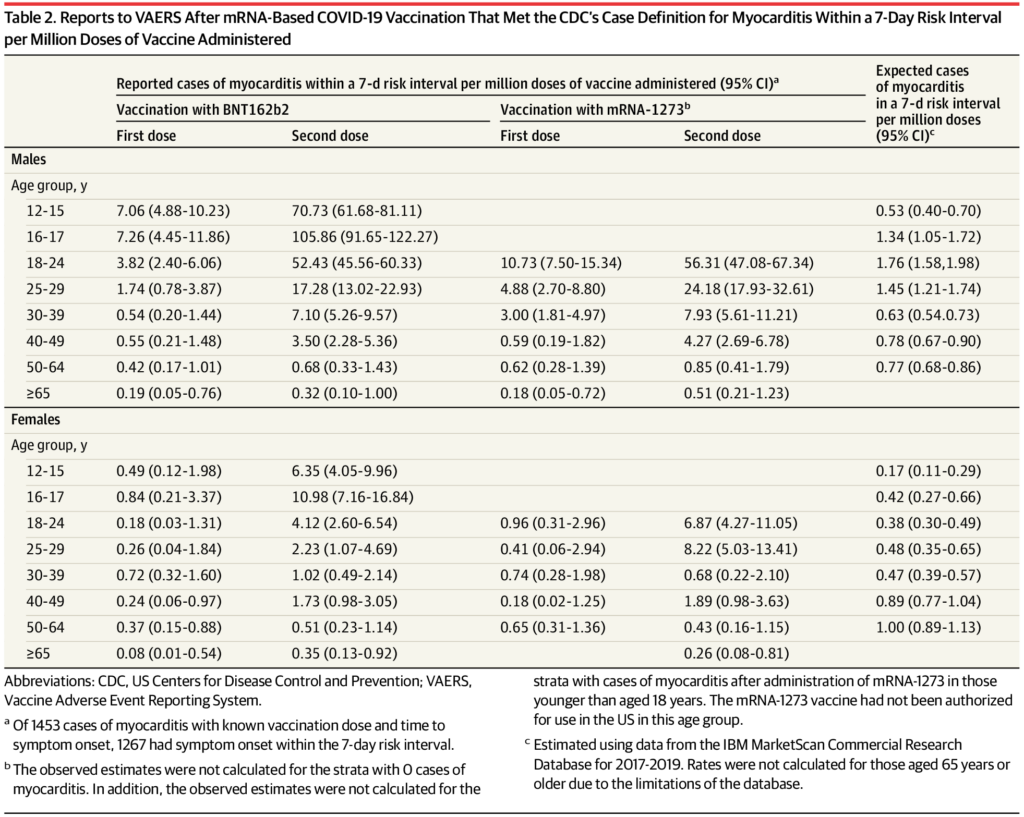 The authors note that underreporting is likely, “given the high verification rate of reports of myocarditis to VAERS after mRNA-based COVID-19 vaccination”, and therefore “the actual rates of myocarditis per million doses of vaccine are likely higher than estimated”.