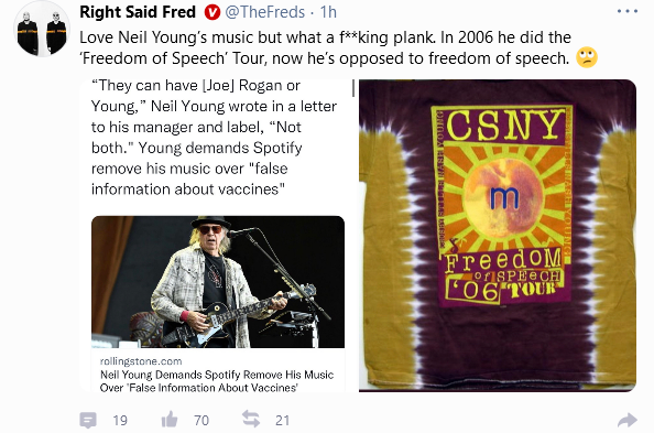 Incredible really – to think that Neil Young and many other artists of his calibre were once upon a time standard bearers for free speech everywhere – but since covid they seem to have all shown their true colours – yes, free speech … but only if hold the correct opinions and appropriate views – wanting people banned for holding different opposing views to yourself is very disappointing to say the least.