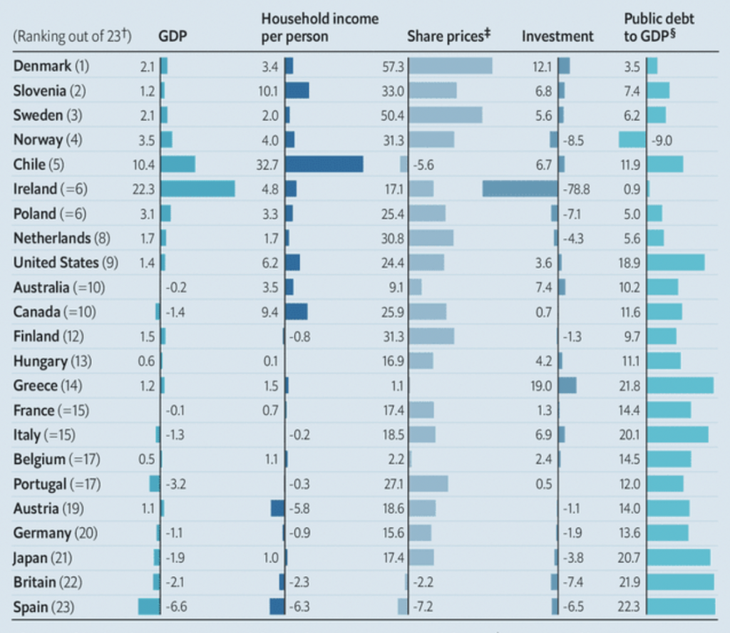 Not a bit of it. The Economist ranked 23 rich countries for overall economic performance during the pandemic, and Sweden finished third, behind Slovenia and Denmark. Their ranking took into account changes in GDP, household income, share prices, investment and public debt.