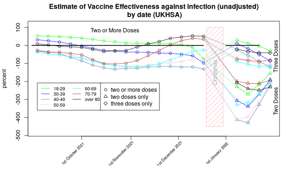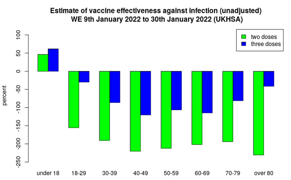First of all, just to make things clear – Table 12 in the UKHSA Vaccine Surveillance Report once again shows data for those triple-jabbed rather than two-or-more doses, as was given for the data for 2021 since September. However, we can estimate the rates for those with only two jabs using data in Tables 9-11 and vaccination data available from the NHS. Using these data we can estimate infection rates by vaccination status (above); from these data we can then estimate the unadjusted vaccine effectiveness for infection for those having two or three doses (below). The infection rates continue to be considerably worse in the vaccinated, both double and triple jabbed, translating to highly negative unadjusted vaccine effectiveness estimates. Note that these figures are rates per 100,000 so take into account the different sizes of the cohorts, meaning it’s not because there are more vaccinated people than unvaccinated.