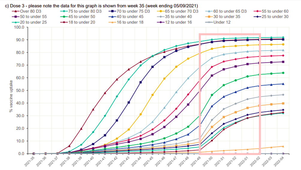 Is this effect enough to explain the sudden increase in cases in the double dosed? Looking at the booster dose rollout data (below), it is clear that the time window for the low point in the vaccine effectiveness curve for the double-dosed is aligned with the rollout of the booster programme in those aged under 40, and there were still high booster-vaccination rates for those aged under 70 around weeks 48-49. Note that the data for the week two and three 2022 vaccine surveillance reports actually come from weeks 49 2021 to week two 2022, which I’ve highlighted in the pink rectangle.