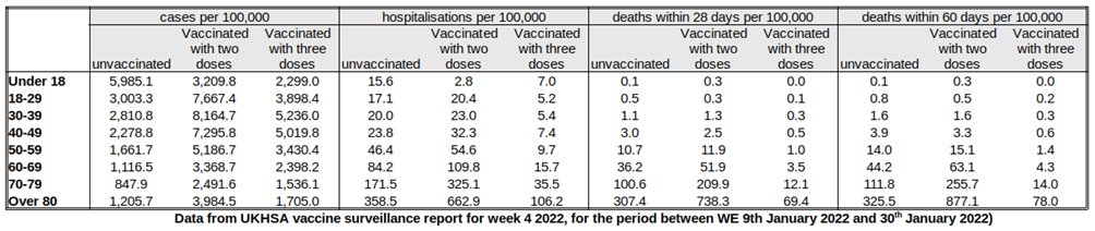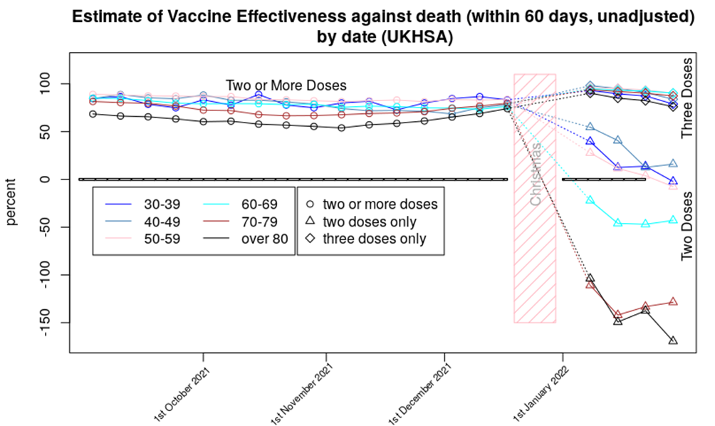 The data for vaccine protection against death shows a mildly worsening picture compared with last week’s Vaccine Surveillance Report, with negative vaccine effectiveness for two doses of vaccine seen for all age groups over 30 other than the 40-50 age range where there is still some positive effect of vaccine. Of course, the series of well-defined data points suggest precision, but in reality there will be uncertainty around each data point – without additional data it is difficult to add error bars or confidence limits. I’d suggest that it is best to consider that two doses of vaccine offer around zero protection against death for those aged under 60. The situation for two dose vaccinees older than 60 is more complex – the data strongly suggest that these individuals will have an increased risk of death compared with the unvaccinated, but I again note the possibility of a ‘healthy vaccinee’ effect, that is, where the increased death rate in the double-vaccinated actually reflects those most close to death not being given a booster. Without data on the morbidities of those that die (and that are hospitalised) it is impossible to confirm or deny the presence of this effect.