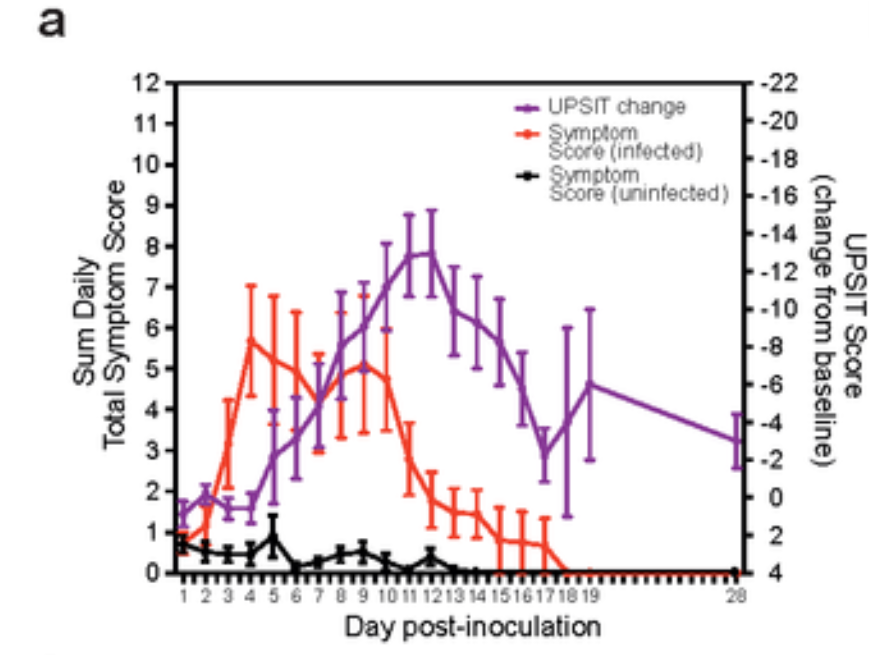 First of all, two of the 36 were found to have developed antibodies between screening and inoculation, so although they were inoculated anyway they were excluded from most of the analysis (they didn’t develop an infection, unsurprisingly). That left 34. Of those, 18 (53%) tested PCR positive, 17 (50%) of them with symptoms and one without. This means 16 (47%) never tested positive, despite being heavily exposed via lying on their back for 10 minutes with a blob of infected snot up their nose. Why did they not get sick? The researchers say investigations of these questions are ongoing.