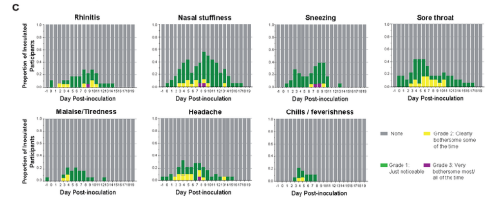 Symptom onset was often earlier, from day two, as can be seen in the charts below. No average value was given for symptom onset; however, the early symptom onset in many cases challenges the common idea that viral load peaks prior to symptom onset and drives pre-symptomatic transmission. That said, the early symptoms here tend to be mild. There are also questions as to how generalisable the results are to a natural infective dose, which is likely much lower.