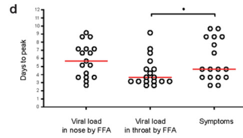Viral load in the throat peaked on average around day three, a day earlier than the average peak of symptom severity on day four, itself a day earlier than the average peak of viral load in the nose (though the average peak viral load in the nose was higher).