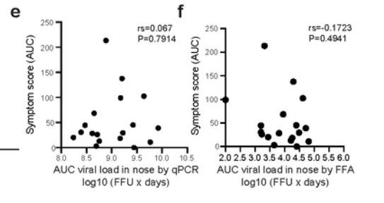 Interestingly, there was no correlation between symptom severity and viral load, measured both using Ct values from a PCR test and viable virus. Note the most symptomatic point in the charts below (the highest on the y-axis) does not have anywhere close to the highest viral load. Significantly, the one asymptomatic infection had no lower viral load or less viable virus than the symptomatic infections (the point sitting on the x-axis). This suggests that infectious asymptomatic infection may be a real phenomenon (though note this study did not test to see whether participants actually infected others).