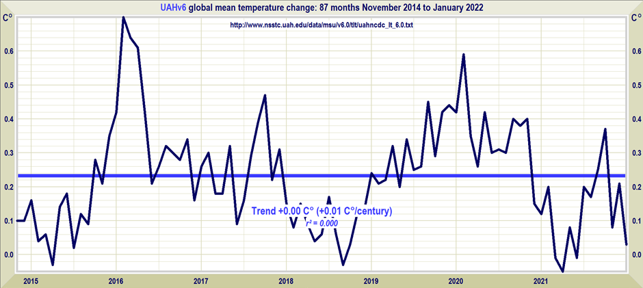 This is the latest January temperature record produced by satellites accurately taking global measurements on a 24 hour basis. It shows barely any deviation last month (0.03°C) from the 1991-2020 average as shown by the blue line. The 13 month red line average reveals movement of just over 0.1°C. Furthermore, the satellite record is now revealing no global warming for seven years and three months.