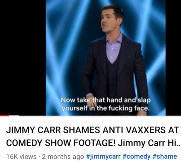 Jimmy Carr rounded on unvaxxed members of his live audience recently (dunno whether as a one off or a permanent new part of his show) and encouraged others to join in showering them with hate.