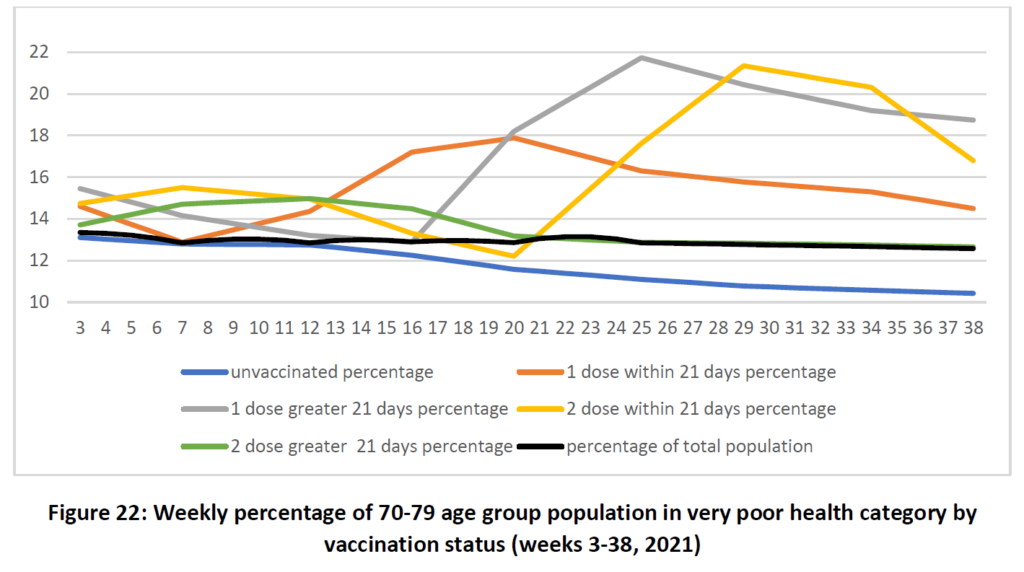 The key thing to notice here is that the percentage of people in very poor health in the unvaccinated category (the blue line) is consistently lower than in the overall population (the black line), and steadily decreases. This means that the unvaccinated are in fact a healthier group than the vaccinated, not less healthy – exactly what we’d expect given the stated policy of prioritising the clinically vulnerable. This contradicts, of course, the notion of a healthy vaccinee effect. As Prof. Neil and colleagues write: