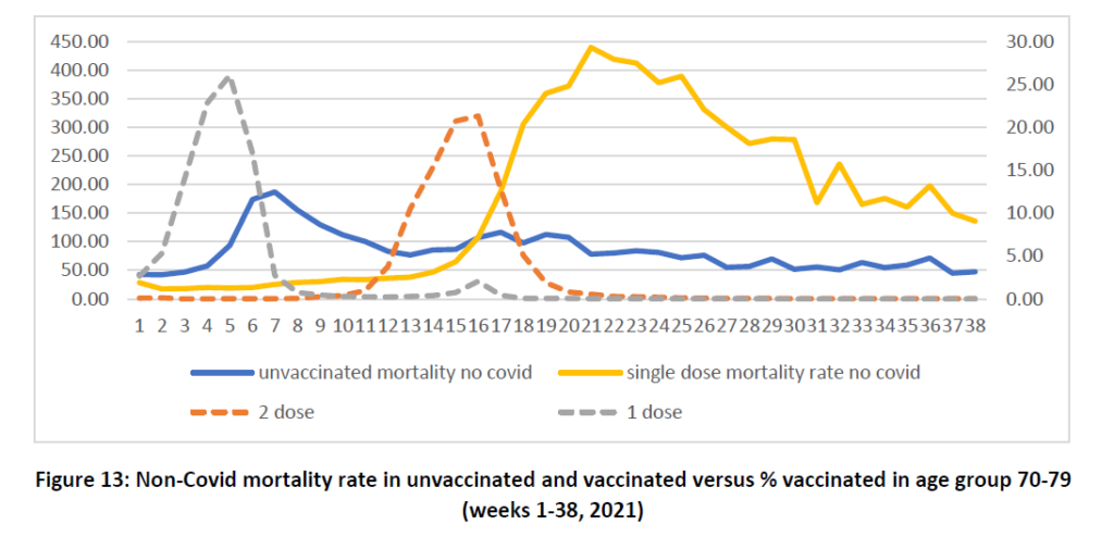 A final piece of evidence comes from comparing the non-Covid mortality rate in the unvaccinated in very poor health (orange line below) to that in the vaccinated in very poor health (blue line). These lines should be the same, as both show the non-Covid mortality rates of people in very poor health, and this should not be affected by vaccination status or a healthy vaccinee effect as we are looking only at those in very poor health. Yet they’re different: the unvaccinated line has spikes around the time of the vaccine rollout while the vaccinated is smooth, flat and consistently lower. As this cannot be explained by a healthy vaccinee effect, Prof. Neil and colleagues argue it is consistent with the miscategorisation of deaths as unvaccinated, with the spike in deaths really being in the recently vaccinated.