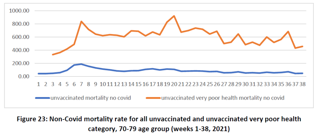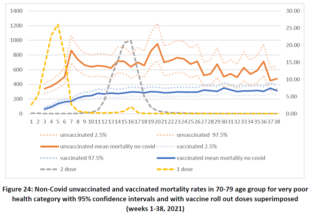 This suggests that not only were those in very poor health not excluded from the dose one rollout, but that they were prioritised: hence the reduced percentage remaining. The decrease rather than increase in the percentage of unvaccinated in very poor health around the time of dose one rollout offers, therefore, a direct refutation of the hypothesis that the increase in non-Covid mortality observed in the unvaccinated at that time was due to them being moribund.