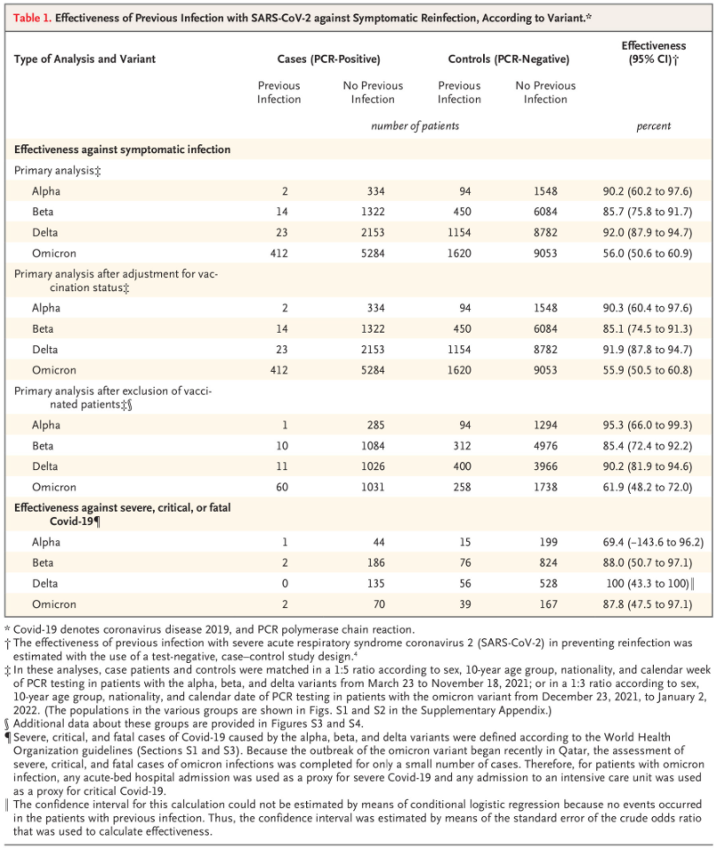 Natural immunity from previous infection remains strong against Omicron, particularly with respect to severe disease and death, a study from Qatar has found.