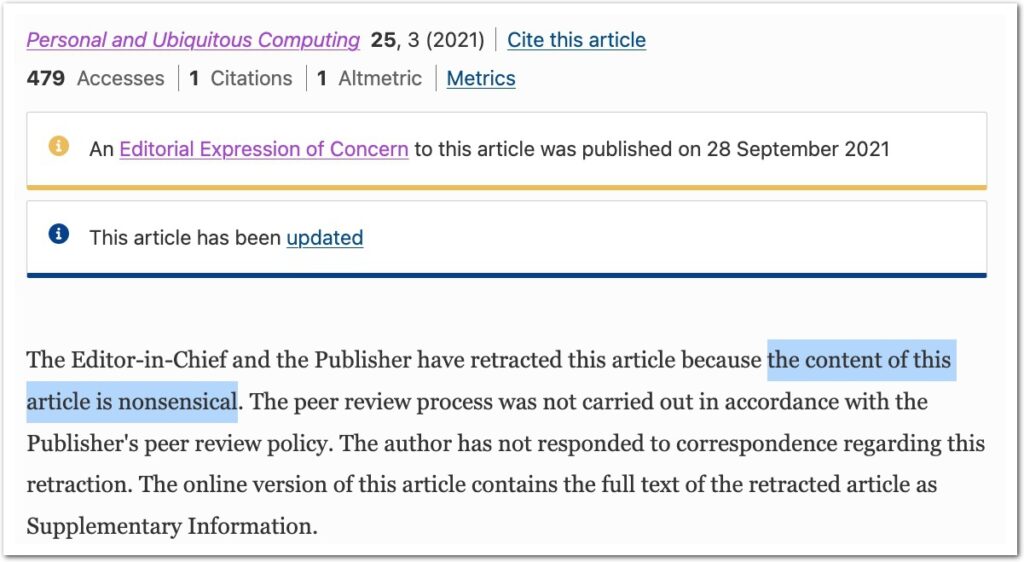 Last August, a cluster of fake scientific papers appeared in the journal Personal and Ubiquitous Computing. Each paper now carries a notice saying that it’s been been retracted “because the content of this article is nonsensical”.