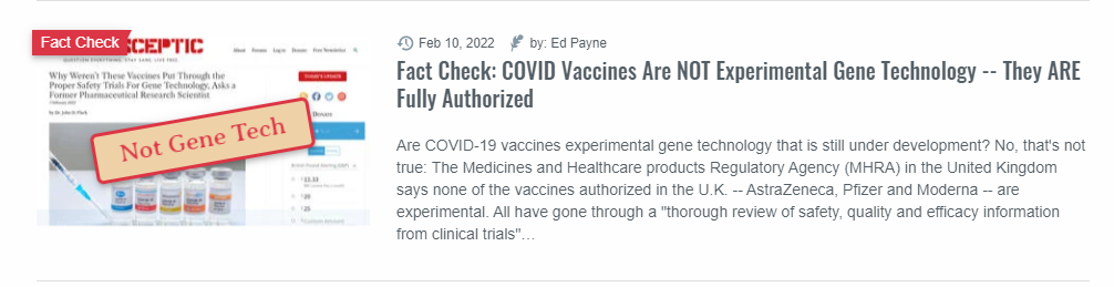 Mr. Payne says that I am “promoting the idea that mRNA-based vaccines… are a form of gene therapy, but this is inaccurate”. He is incorrect. Nowhere in my article do I use the term “gene therapy”. In fact, I was diligent in not doing so for the very reasons he quotes. I don’t need to be lectured by a journalist on what gene therapy is. How to define this new class of medicine is worthy of debate. Given that I was attempting to cover both mRNA and DNA based products, I chose to use the term gene-based ‘vaccines’. I think this is as accurate as one can get and stand by it. Gene technology is of course an umbrella term for a very wide range of research applications. This means the claim on the front of the Lead Stories article (depicted below) is false – indeed, the article itself does not dispute that the ‘vaccines’ are gene technology.