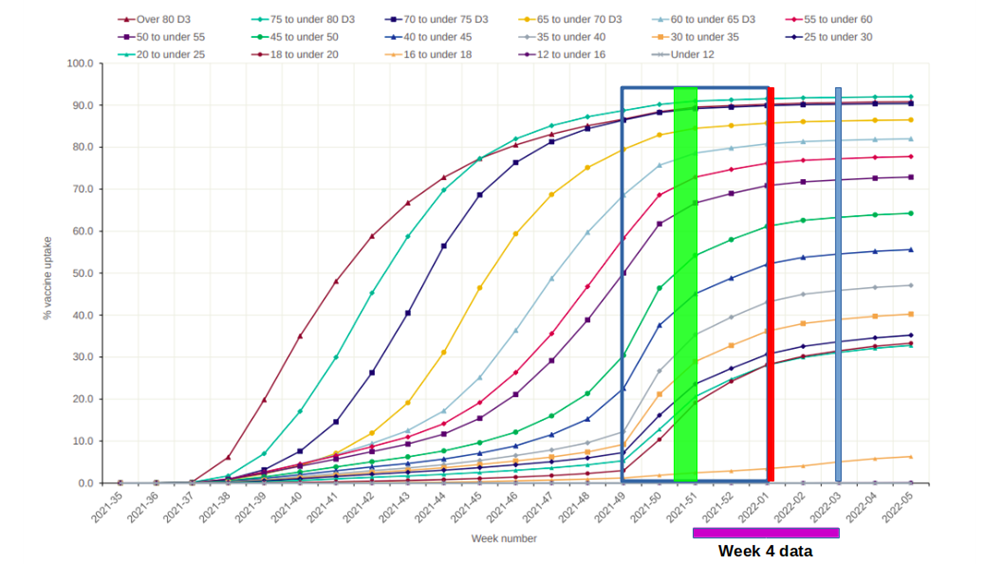 The data for the week 4 report is for up to week 3 (indicated by blue vertical line), as there is a delay of a week in their collation of the data. As the data is made up of four weeks’ worth of data, this covers the period between the end of week 51 2021 and the end of week 3 2022 (indicated by purple bar below the graph). However, the data is for 14 days after vaccination, so the relevant vaccination data should be taken from the blue square shown in the figure, from the end of week 49 2021 to the end of week 1 2022. Instead, the UKHSA took its vaccination data as that at the end of this period, shown by the red vertical line. As is apparent from the graph, because of the rush to boost the population during this period, the number vaccinated at the point of the red line is significantly greater than at the start of the period in question (considerably so for younger age groups). Really, the estimate of the population boosted during this period should be a weighted average across the study period; this will lie somewhere within the green rectangle (exactly where is dependent on the shape of the curve between over the period in question).