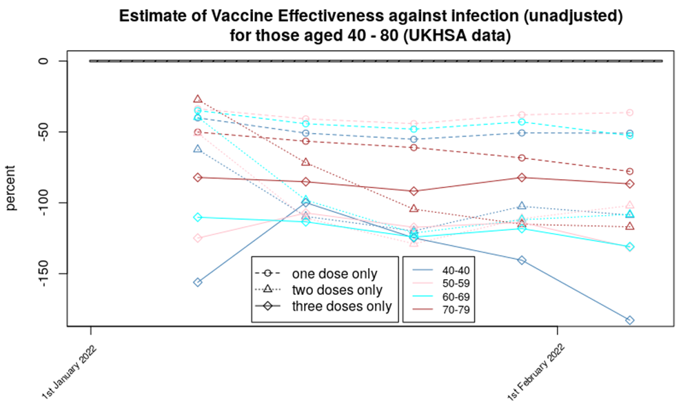 - Data for dose 2 and dose 3 of the vaccines appear to show a somewhat similar level of protection, at around minus-100% – that is, the vaccinated appear to be approximately twice as likely to become infected with Covid as the unvaccinated. The pronounced downward trend in the data is likely a result of the vaccines’ protection being even worse for Omicron variant. There is a hint in the data that in the weeks following the booster (but after the 14 day post vaccine period) there is an increased risk of infection (indicated by the upward trend in the data between the first and second data point for those aged 40-49 and, to a lesser extent, those aged 50-59).