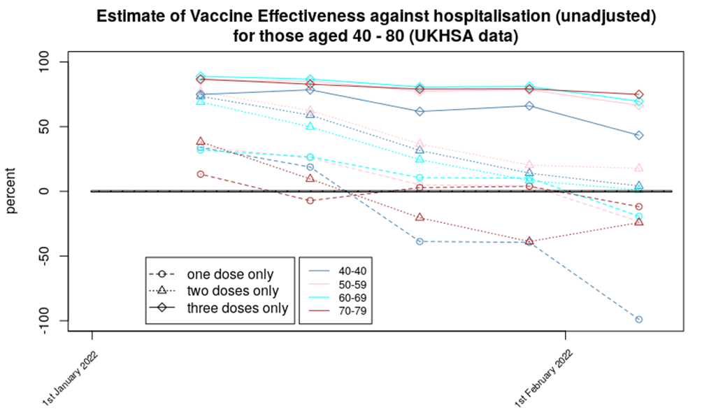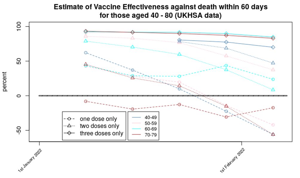 Three doses of vaccine appear to offer a reasonable protection against death, two doses show significantly reduced protection (especially for those aged 70-79 where it is negative), while a single dose appears to result in an increased risk of death, compared with the unvaccinated. Again, the downward trend in the data suggests that Omicron variant has made the vaccines’ job much more difficult.