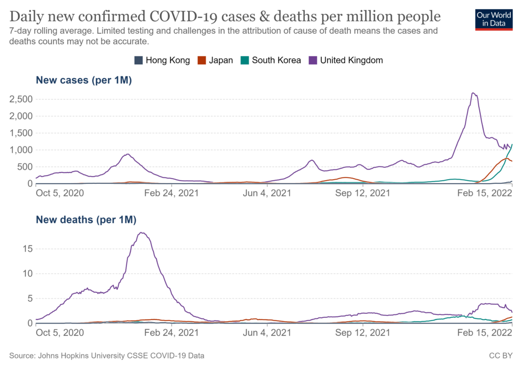 Perhaps most of the infections are concealed somehow – Hong Kong reportedly requires every single positive Covid case to isolate in Government quarantine facilities, which surely gives a strong incentive to keep quiet about it. But even so, you have to wonder why an outbreak that is barely registering in reported infections or deaths (so far) is causing hospitals such problems.