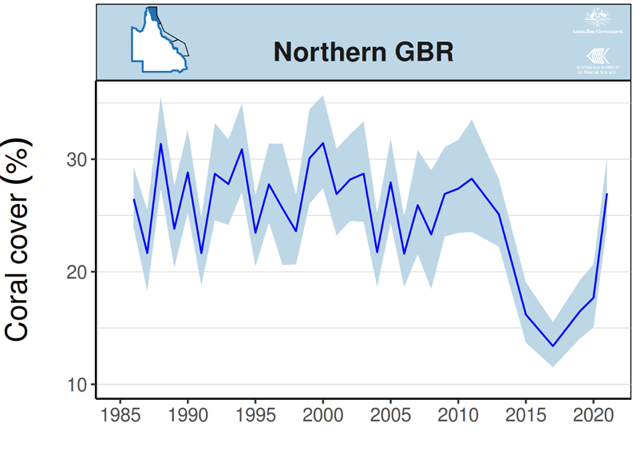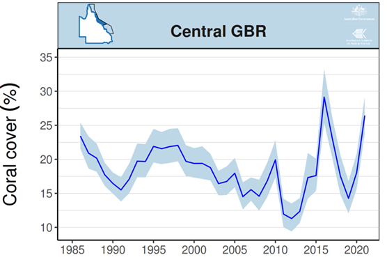 Tropical coral thrives in waters between 24°C and 32°C. It is highly adaptable but seems to dislike sudden changes in temperature, often caused by natural weather oscillations such as El Niño events. Under such conditions it can die back and bleach, but as recent evidence shows, it quickly recovers when normal localised conditions return. Global warming started to run out of steam a couple of decades ago and there has been a standstill for at least seven years. However, minor long term temperature changes are unlikely to cause many problems for highly resilient coral. The resilience is clearly shown below in the latest AMS figures for the northern Reef.