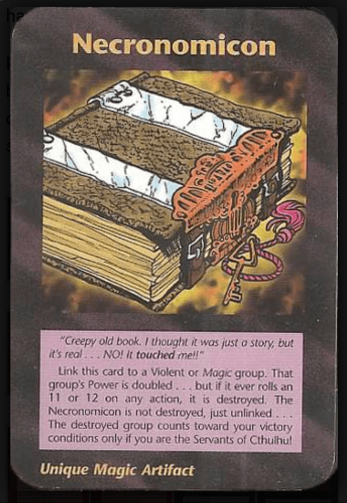 Continuing on from the comment about ‘the cabal’ by Fireweasel above, the card that disturbs me the most is this one. Named Necronomicon. The word, at first glance, bears a striking similarity to Omicron (Moronic) but after investigation appears to be more ominous. As per this link in the Wikipedia reference to the book with the same name.