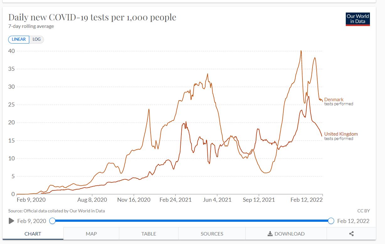 Denmark had pretty consistently out-tested the UK, except for the period between June and October 2021.
