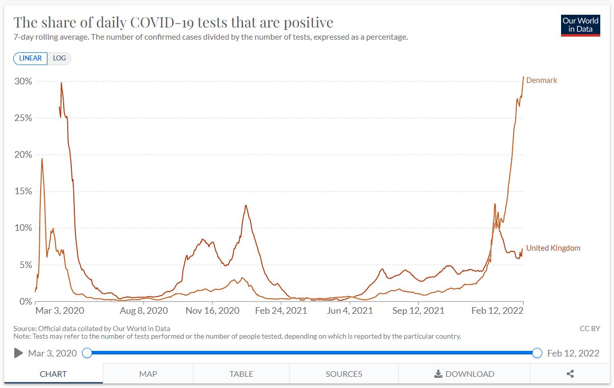 However their share of tests which were positive was generally lower than the UK until December 2021 when it absolutely took off.