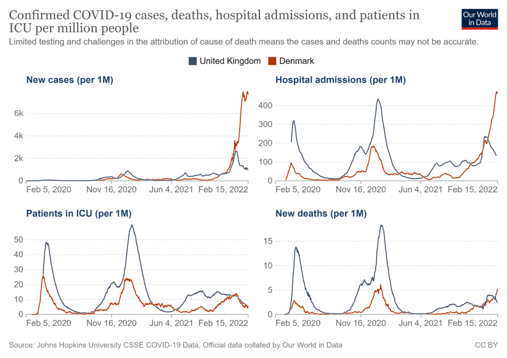 This is in fact a perplexing difference. One explanation might be the different variant. But what about the different products used for vaccination? Might this have something to do with this? I believe in the UK AZ was used predominantly, but Pfizer in Denmark if I’m not mistaken.