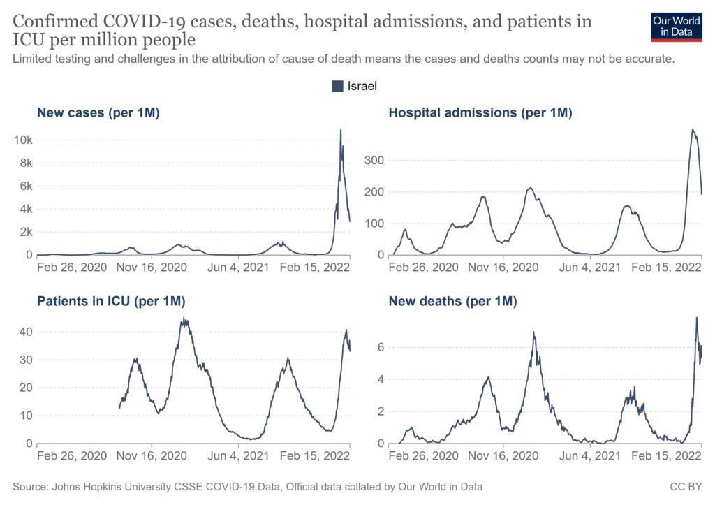 The oddity in particular of the deaths-to-ICU ratio being up in Denmark, Sweden and the U.K. needs explaining. It may be some kind of artefact, such as because deaths with-but-not-of Covid are higher, but it needs looking into. In Israel that ratio isn’t up, but that’s because ICU admissions also went high as deaths did. In Israel and Denmark new Covid death records have been hit or approached – though the level of Covid deaths in those countries is not much higher than in the U.K. or Sweden, it’s just that Israel and Denmark had milder previous waves. This means at least part of the explanation may be that Sweden and the U.K. have more acquired immunity, which is more robust than vaccine immunity. Whatever the explanation turns out to be, the fact that record or near-record deaths have occurred in Denmark and Israel despite vaccination and the mildness of Omicron is striking and should prompt further investigation.